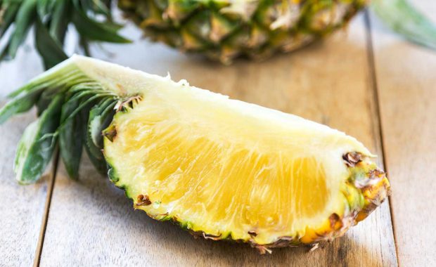 Préparation Retirez le panache de l’ananas, éliminez l’écorce, puis fendez le fruit en quatre dans la hauteur, retirez la partie centrale trop