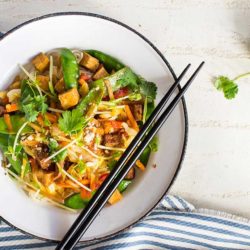 Faire revenir le tout au Wok à l’huile d’olive et assaisonner de Cumin, Curry, Cannelle et Estragon.