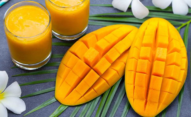 Préparation Pelez la mangue et coupez la chair en morceaux.Mixez tous les ingrédients et servez frais.