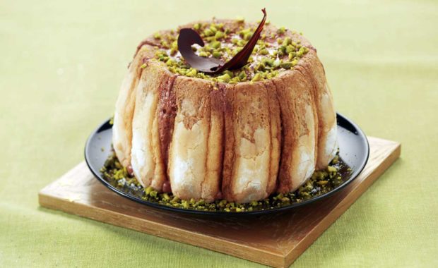 Charlotte aux pistaches et chocolat amer