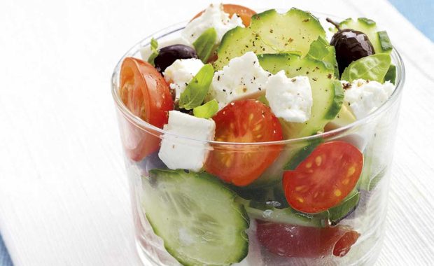 Préparation : Découpez les tomates en rondelles et les disposer dans vos verrines. Ajoutez le concombre et les olives noires et mélangez